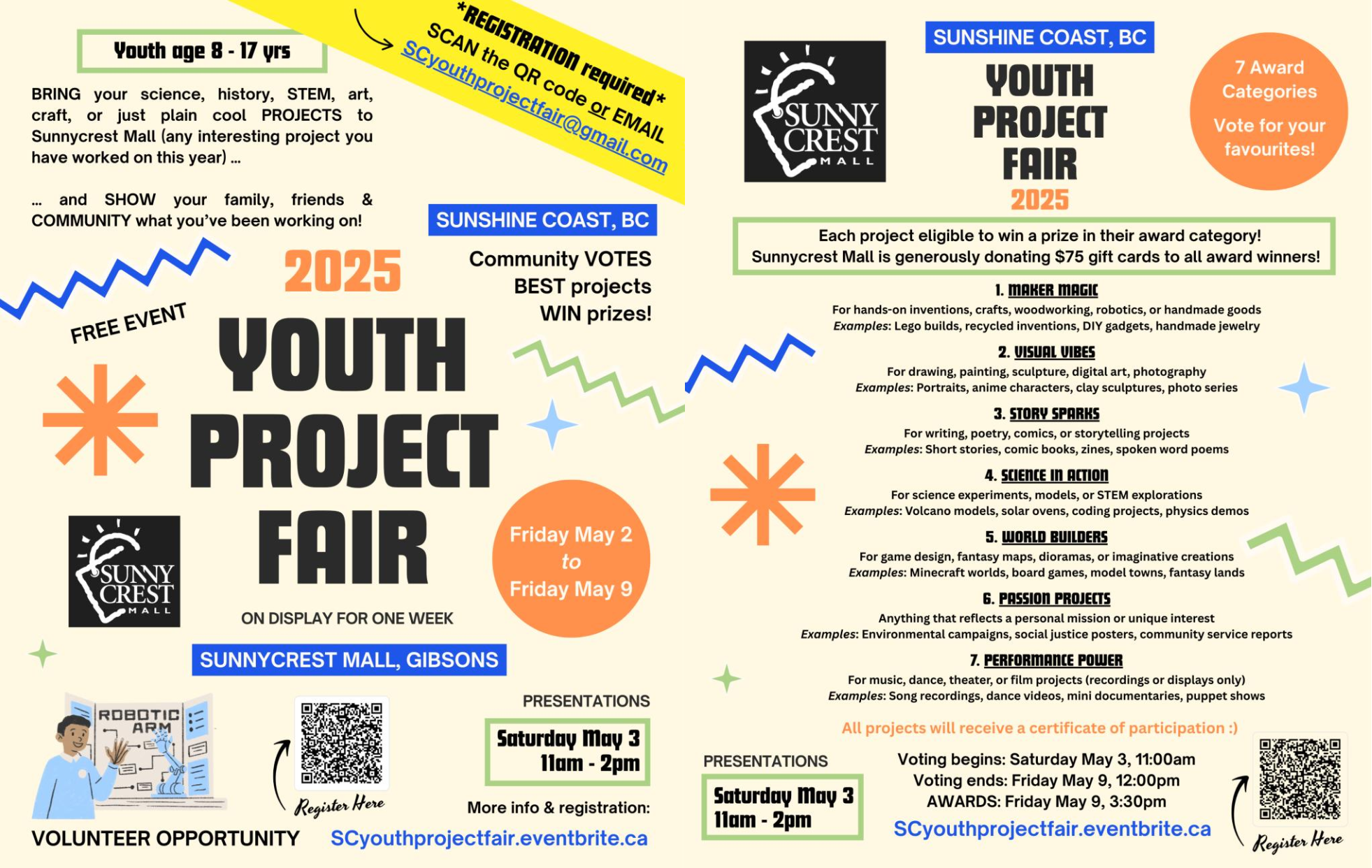 Ignite your curiosity with Youth Project Fair at Sunnycrest Mall. Youth (8-17 years old) will display their cool PROJECTS and the community gets to vote!